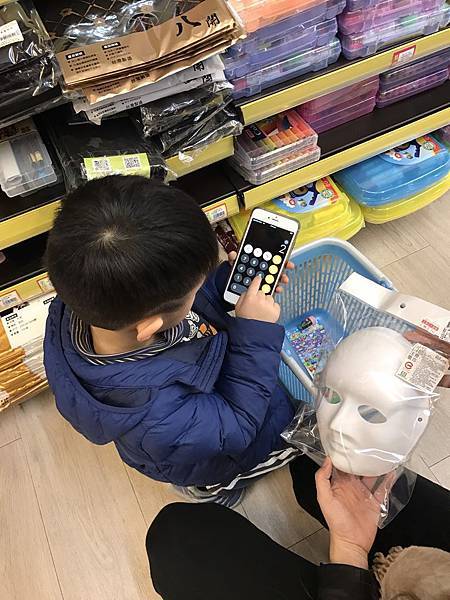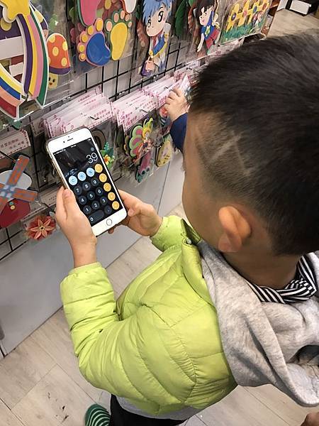 弟弟則跟著哥哥買,接下來他們想買漂亮的花紋紙、亮片、小木頭、摺星星的紙來裝飾他們的面具,但是他們算不出來是否超出預算,我借他們計算機開始練習按,每選一樣東西就加總一次,