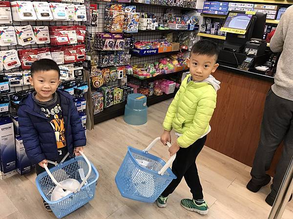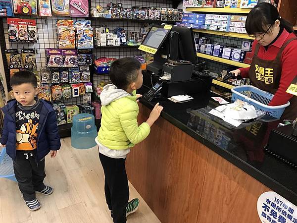 最後結算,本來兩人都買52元要補給我2塊他們的零用錢,結果哥哥又突然拿出一樣東西放回去,變成還可以拿3元回去存進撲滿,兄弟倆開心的自己排隊結帳,買回自己喜歡的勞作材料。