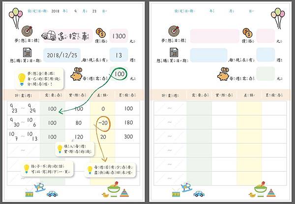 首先,先跟神隊友坐下來一起討論一下,你們一整年要給小孩子這種大筆零用錢的時間點跟金額*,例如我們家是『過年、生日與耶誕節』三個節日可以有較大零用錢收入(或稱禮物金,隨著節日不同有不同名稱),至於要給的金額則依各家庭狀況、孩子年齡及各孩子用錢習慣彈性調整,重點在於『明確讓孩子知道與預期』。各位可以選擇在一年之初(過年尤其適合)告知孩子整年規劃好的的現金流情況,讓他們自己在記帳本前面記錄下來,他們幾月幾號會有多少的大筆零用金進來,如果有想買的東西,自己需要規劃金額分配,在我們設計的記帳本後面,有『夢想清單』,讓孩子寫下自己想買的東西,並計劃每週存多少錢,多久可以存到,他們也可以將這幾筆較大的零用錢流入加入他的購買計劃中,並努力去達成。